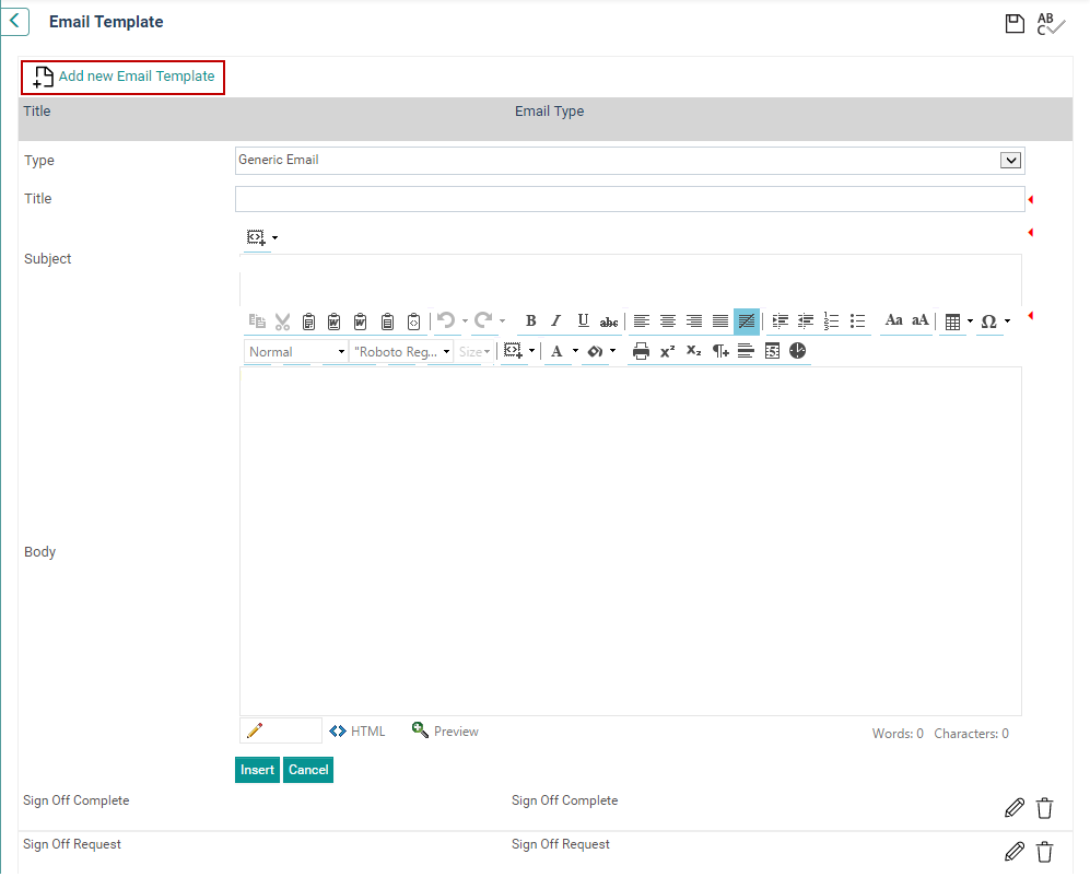 STEP 4: Click 'Insert' to add the new email template to the system.
